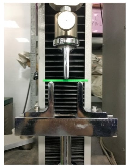 Three-point bending test was performed on standard specimens (Figure 17b), and the compression speed was 2 mm/min. The experimental set up is shown in Figure 23.