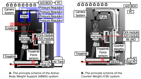 Two BWS systems were used to implement in this study: the ABWS system power by the pneumatic artificial muscles (PAMs) and the CW system. A detailed description of the ABWS system was described in the previous study [42]. Basically, the AWBS system contains four PAMs connected directly to the subject body via a harness. Four proportional pressure regulators drove the four PAMs. The unloading force was measured by load-cells and controlled actively by the controller. The principal scheme of the ABWS is shown in Figure 1A. Because of the flexibility of four PAMs, the therapist can apply many weight support strategies in gait training such as one-side support [43], or center of pressure (COP) tracking by the supported force. In this paper, the weight support strategy was implemented similarly as the previous study [42]. Such that the supported force from the ABWS system would follow the movement of COP. When the COP moves from left to right, the support force will decrease on the left side and increase on the right side. Inversely, when the COP moves from right to left, the supported force amplitude will decrease on the right side and increase on the left side.