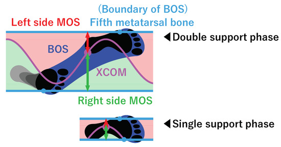 in which represents for the BOS boundary, x and v represents the COM in frontal direction and its velocity, respectively. represents the natural frequency, which is calculated base on the pendulum model with the rotation axis at the foot and the pendulum at the COM. In Equation (1), the BOS boundary was determined using the distance between the markers on the left and right fifth metatarsal bones during the double support phase [45,46]; however, it was adjusted as the distance between the markers on the fifth metatarsal bone and the first metatarsal bone during the single support phase [47]. The definition of the BOS boundary is given in Figure 3.