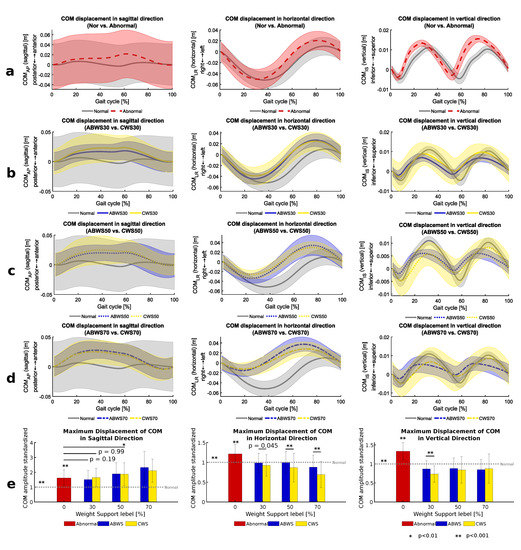 Figure 5 shows the comparison of the COM trajectories while subjects walked on the treadmill with different conditions. All the trajectories of all subjects were normalized, such that the gait cycle from 0% to 100%. In Figure 5, the mean trajectories are shown as the bold strokes, while the blurred area surrounding represents the variance of the COM trajectories (standard deviation). Row (a) shows the comparisons of the COM trajectories between normal walking and abnormal walking in the sagittal, horizontal, and vertical direction, respectively. The row (b), (c), and (d) represent the comparisons of the COM trajectories between the ABWS system and the CW system at the unloading level of 30%, 50% and 70%, respectively. The final row, row e, shows the comparisons of the maximum displacements of the COM in three directions: sagittal direction (anterior-posterior), horizontal direction (lateral), and vertical direction. From Figure 5, we can observe that the COM trajectories are modified due to hard walking under abnormal walking conditions. In the horizontal and vertical direction, the peak values of the COM trajectories appear sooner than the normal walking condition. The same results can also be observed in walking under the ABWS and CW system at all unloading force levels. In terms of the maximum displacements of the COM, the significant differences are observed in normal walking conditions for all directions (p < 0.001). The maximum displacements of COM during walking under the abnormal condition were significantly different from the walking under ABW and CW system in both horizontal and vertical directions at all unloading force levels. In the sagittal direction, only at 30%, the significant difference of the abnormal walking versus unloading systems cannot be found (p = 0.19 for ABWS and 0.99 for the CW system). In comparison between the ABWS and CW system, we found that the maximum displacements of COM in sagittal direction are not significantly different. However, the significant differences are found in both horizontal and vertical directions (p = 0.045 at 30% unloading force in the horizontal direction, p < 0.001 in other cases).