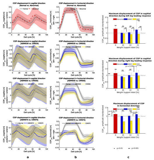 The details analyzing of the COP trajectories are shown in Figure 7. The column (a) and (b) show the comparison of the COP trajectories in the sagittal and horizontal direction in the gait cycle, respectively. From top to bottom, column (a) and (b) show the comparison of the trajectories between the normal walking versus abnormal walking under ABWS and CW system at 30%, 50%, and 70% unloading force. In Figure 7, the COP trajectories in the sagittal plane show two peaks, which represented two times step for the left and right foot. The COP trajectories in horizontal direction commonly have two steady stages at bottom and top, which served for the left and right stance phase. The COP trajectory variances in terms of the abnormal walking condition and abnormal walking under the unload system (ABWS and CW system) are higher than the normal walking case. The shape of the COP trajectories was still maintained at 30% and 50% unloading force and more distorted at 70% of unloading force. The further quantities of the maximum displacement of COP are shown in the column (c). The COP maximal values in both the sagittal and horizontal direction of the abnormal walking condition significantly differed from the abnormal walking under the ABWS and CW system (p < 0.001). During the left leg loading response, no significant difference was found of the maximum values of COP of the ABWS system and the normal walking condition in the sagittal plane (p = 0.149 at 30% weight support, 0.656 at 50% weight support, and 0.670 at 70% weight support). In contrast, the maximum COP values of abnormal walking under the CW system significantly differ from the normal walking condition. The significant differences could also be observed of the maximum displacements of the COP between normal walking versus abnormal walking under the ABWS and CW system during the right leg loading response in both sagittal and horizontal direction (p < 0.001). However, the mean value of the maximum displacement of COP of the abnormal walking under the ABWS system was higher than the cases of using the CW system, and closer the normal walking case.