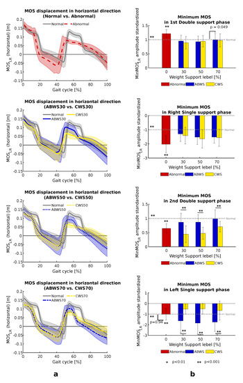 Figure 8a shows comparisons of the average MOS of all subjects varied in a gait cycle while walking at different conditions, from to bottom, normal walking and abnormal walking, abnormal walking under the ABWS, and CW system at 30%, 50%, and 70% weight support. The MOS of the abnormal walking kept the same shape as the normal walking; however, the MOS was more profound in the negative side. When comparing the ABWS and CW system at 30%, 50%, and 70% weight support, the MOS was mostly similar. Figure 8b presents the detailed comparison of the minimum at four gait events, the first double support, the single right support, the other single support, and the left single support phase. From The Figure 8b, the significant differences of the minimum MOS of the abnormal waking with the walking under ABWS and CW system were observed. The MOS of the abnormal waking was also significantly higher the normal walking at the first double support and the right single support phase (p < 0.001), smaller in the second single support phase (p < 0.001), and no significant difference at the left single support phase (p = 0.94). The statistical analysis indicated that MOS of the abnormal walking under the ABWS significantly differed from the CW case at the second double support phase and the left single support phase.