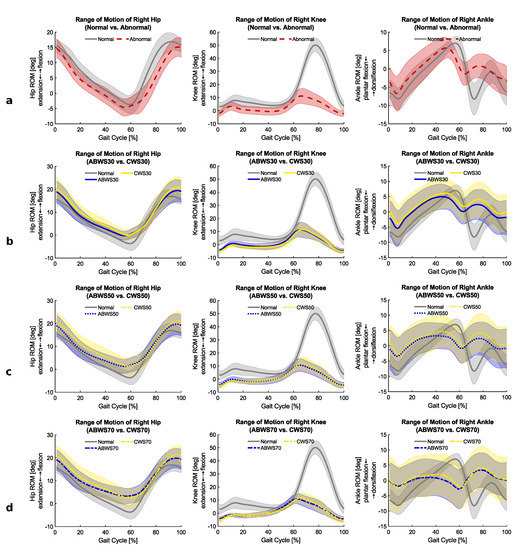 Figure 9 shows the comparison of the range of motion of the hip, knee, and ankle angle. In Figure 9, row (a) shows the comparison of the hip, knee, and ankle joint movement between normal walking and abnormal walking. The row (b), (c), and (d) represent the comparison of ROM of the abnormal walking under the ABWS and CW system at 30%, 50%, and 70%, respectively. In Figure 9 we show that the angle pattern of the hip joint of the abnormal walking condition and walking under the ABWS and CW system still maintained the same shape as the normal walking; however, the knee and ankle angles were distorted due to the restriction of the right knee joint and 3 kg-weight on the right ankle angle.