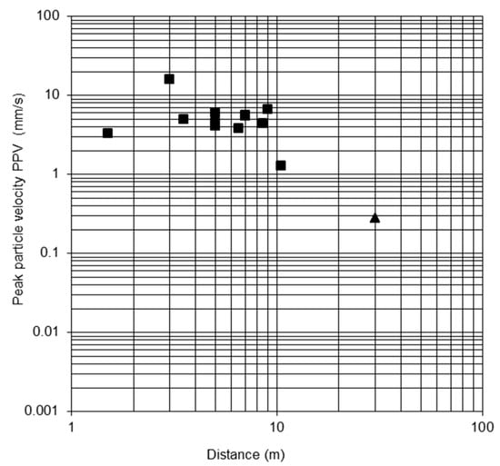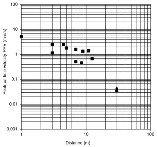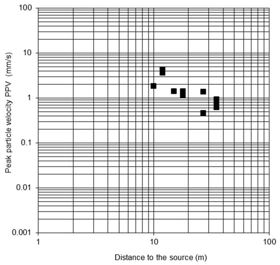 where α (m−1) is an empirical coefficient based on the damping characteristics of the material [44]. Depending on the case, both methods could be used successfully, obtaining even similar results at short or middle distances. Nevertheless, in some cases, such as the one studied here, the first method cannot be used to properly predict the peak particle velocity over all the range of distances. Therefore, it is assumed that Equation (2) is the most adequate expression in this case study.