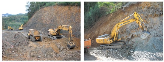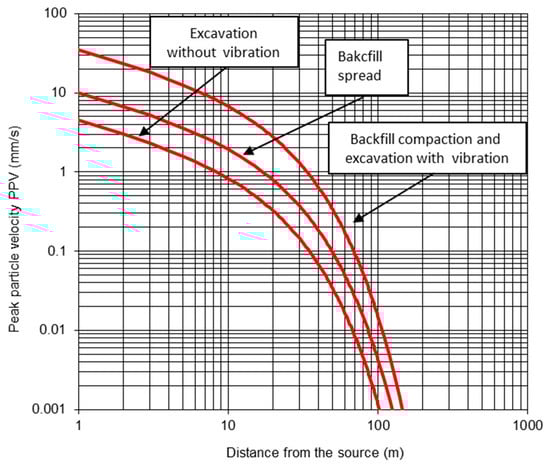 Figure 8 gathers the vibration behavior generated by each type of equipment in a highly fractured shale rock mass and backfill material. Taking into account the legal requirement established by the administration, the minimum safety distance to the historical site is 35 m for the excavation operations, 50 m for the bulldozer and 80 m for the vibrating roller. The huge impact, in terms of the vibration generated, by the vibrating roller has also been mentioned in previous research [48]. During the excavation process, the hydraulic breaker hammer practically was not used, while the vibration ripper worked most of the excavation time.