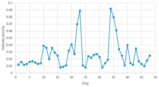 If Equations (3)–(5) are applied for a distance r = 100 m from the vibration source, the maximum velocities are: excavator VExmax = 0.0012 mm/s, ripper VRmax = 0.0012 mm/s, vibrating ripper VVRmax = 0.015 mm/s, bulldozer VBDmax = 0.0043 mm/s and vibrating roller VCRmax = 0.015 mm/s. These values, multiplied by the type and number of machines working each day and the background constant velocity VBmax = 0.005 mm/s give the potential velocity estimated, as in Figure 11, validating the accuracy of the equations proposed for the purpose of the study.