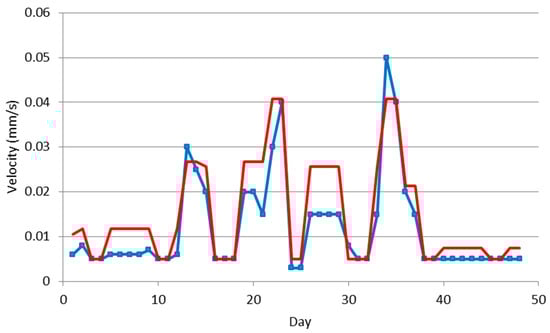 Maximum filtered daily velocities, in blue, and estimated values using Equations (3)–(5), in red.