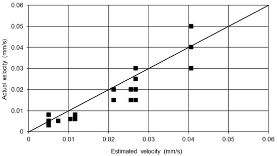 Correlation between actual velocities and velocities estimated by Equation (6).