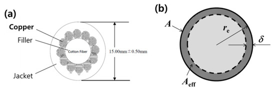 As discussed in [26], serious power loss such as proximity effects can occur as turns of wiring increase in the system. Therefore, a single-turn cable is employed in this study, and as a result, we can neglect the power loss safely and propose a simple approach described below to estimate the skin depth caused by the skin effects in the cable. To estimate the heat generation owing to an electric field in a wire, the skin depth [16,25] should be estimated. It is evident that the heat generation increases when the coil resistance increases, and therefore, the coil resistance has to be minimized by employing conductors of appropriate shapes and cross-sections. The conductor resistance is increased due to the skin effect, which distributes the current primarily on the surface of the conductor instead of uniformly over the cross-section [15]. As a piece of string of copper has a diameter of d = 0.32 mm and there are 540 pcs (45 pcs × 12 strands; see Figure 1a), the overall area of the cable (A) is given by A = πd2/4 × 540 pcs. Therefore, the effective radius (re) was obtained to be re = 3.7181 mm from A = πre2. The skin depth (δ) in the cable is caused by the skin effect. Here, δ depends on the frequency of the current, as well as the electrical and magnetic properties of the conductor, as follows [15],
