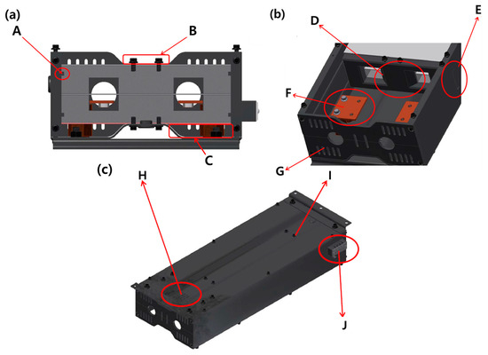 Pickup module prototype fabrication concept: (a) Front section view, (b) inside view of the rear part, and (c) three-dimensional view. The uppercase English alphabet represents design improvements to ensure mass production and reliability, and detailed descriptions of design improvements are described in the main text.