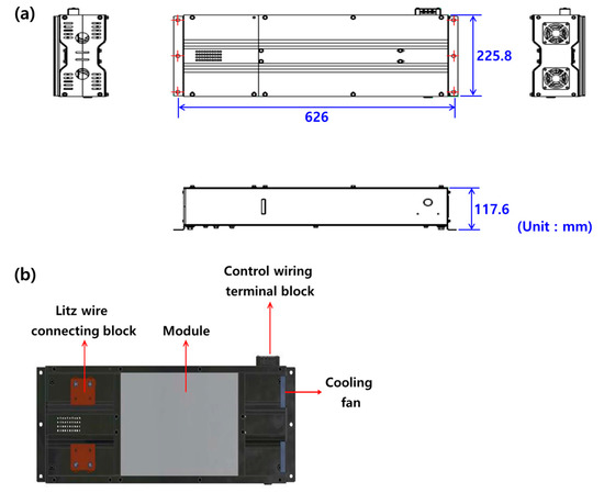 (a) The external dimensions of the manufactured prototype of the pickup module, (b) the internal layout of the pickup module. Several essential parts, such as the cooling fan, control wiring terminal block, and Litz wire connecting block, are installed inside of the product.