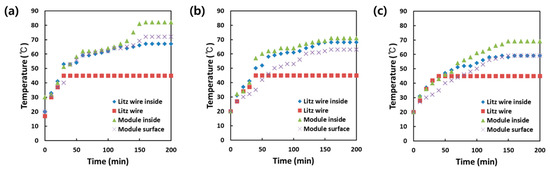 Experimental results of temperature measurement for three candidates: (a) Module A, (b) module B, and (c) module C.