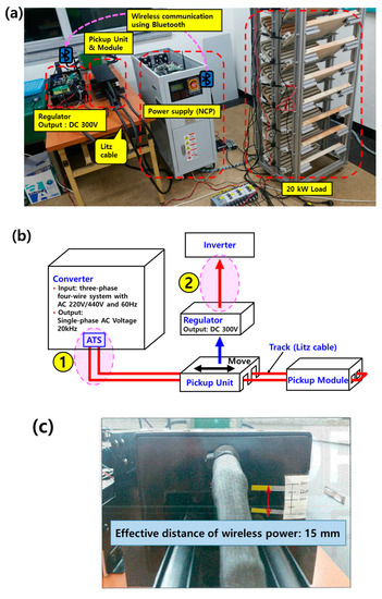 An experiment for confirming the reliability of the performance of the manufactured module was conducted. The experimental configuration is briefly described here and the details can be found in [23]. Module C (Figure 4) was placed at the place labeled “pickup unit & module” in Figure 6a. Then, regular three-phase AC 220 V/440 V 60 Hz voltage was converted using an automatic transfer switch (ATS) to a single-phase 20 kHz AC voltage, and a pickup unit was placed over a Litz cable, which flows the 20 kHz AC voltage to examine the wireless charging efficiency. As the reactance value decreases due to the reduction in the length of Litz cable, the capacitance value must be adjusted to satisfy a given resonance frequency (here, 20 kHz). This is achieved through Bluetooth communication, as shown in Figure 6a. The wirelessly charged electricity from the pickup unit is now regulated to DC 300 V for other purposes. The maximum power capacity of the developed WPT system is 200 kW. In our WPT system, AC to DC conversion is performed twice: On the primary coil and on the pickup sides, as shown in Figure 6. In our system, the voltages used for both the three-phase power source as an input and the coil for the transmission were 380 and 670 V, respectively. If it was more than 200 V, the efficiency would generally be 99% when considering the loss of the voltage drop caused by the diode used in the rectifier. Therefore, the effect of the performance of the rectifiers used in our system on the overall system would be negligibly small. In Figure 6b, we are looking at two places, labeled as 1 and 2, to check the wireless charging efficiency (see Table 2).