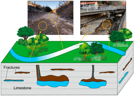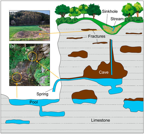 Karst regions contain abundant exposures of limestone or dolomite above the erosion surface, and a well-developed groundwater system formed by the erosion of these rock bodies. A variety of distinctive karst landforms occur both on the ground surface and underground. The term karst was originally used for the limestone regions of Slovenia and Croatia in the former Yugoslavia, and it referred to desert land covered with rocks. Owing to the geological characteristics and excellent underground conduit development in limestone regions, underground seepage of rainwater is rapid, and groundwater recharge is remarkably high [1]. In addition, a karst terrain exhibits unique geological features, and has a significant effect on the water quality of rivers and groundwater due to water–rock interactions [2] (Figure 1).