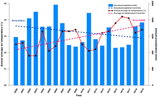 Annual precipitation and average air temperature in the study area from 2000 to 2019.