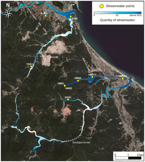 The water sampling points are shown in Figure 5. The 9 stream water sampling sites are classified according to stream water quantities. Five points (HMS1, HMS2, HMS8, HMS11 and HMS14) were located in the stream channels that have 50–100% of the stream water, and four points (KGS1, SJS1, SJS4 and YSS3) were located in the stream channels that have 0–50% of the stream water. The water samples (3 L) for microbe analysis were filtered using a 0.25-µm pore filter. Water samples (100 mL each) were transferred to acid-washed polypropylene bottles for chemical analysis of cations and anions after filtering through 0.45-μm polyethersulfone (PES) filters (SP13P045SL, Hyundai Micro., Ltd., Seoul, Korea). Water temperature, pH, dissolved oxygen (DO), oxidation-reduction potential (ORP) and electrical conductivity (EC) of the groundwater and stream water were measured in the field using a portable meter (HORIBA, Ltd., Anyang-Si, Korea).