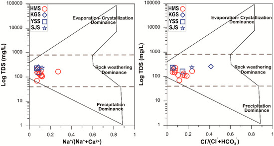 Major ion chemistry of the stream water is an important tool for determining solute sources, and for describing water evolution as a result of water–rock interaction that leads to the dissolution of carbonate minerals, silicate weathering and ion-exchange processes [6,49,50]. Hydrochemical data are plotted in the Gibbs diagram (Figure 7) to understand the source of the solutes. The Gibbs (1970) diagram is a powerful and widely used tool for analyzing geochemical processes and trends in natural waters [51,52]. It assumes that a clear semi-logarithmic diagram of TDS (ordinate) versus the weight ratio of Cl−/(Cl− + HCO3−), or Na+/(Na+ + Ca2+), provides information on the relative importance of three major mechanisms controlling hydrochemistry: evaporation–crystallization, rock weathering and atmospheric precipitation. All the analyzed stream water samples fall in the rock weathering dominance area of the plot, which suggests that chemical weathering of the rock-forming minerals is the main process that contributes ions to the stream waters. The Gibbs plots suggest that most of the points marked red and blue, with seasonal variations in chemistry, were mainly influenced by the rock weathering processes, as they are plotted in the middle left of the diagram.
