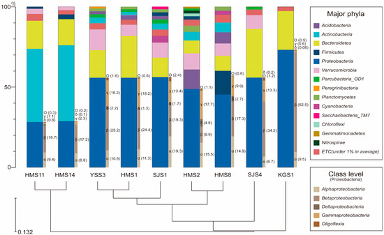 Proteobacteria was the most abundant phylum in all the samples, at 28.79–73.20%. Bacteriodetes were the second most abundant phylum at 7.95–30.40%. Actinobacteria was the other prevalent phylum in water samples HMS14 (47.31%), HMS11 (45.60%), HMS8 (6.05%), HMS2 (5.37%), SJS1 (3.79%), YSS3 (3.35%) and HMS1 (1.94%). The phylum compositions of HMS11 and HMS14 showed a similarity, with high proportions of Actinobacteria and the absence of Acidobacteria. Both of these sample points were located close to the East Sea. Furthermore, samples KSG1 and SJS4 also did not have Acidobacteria.