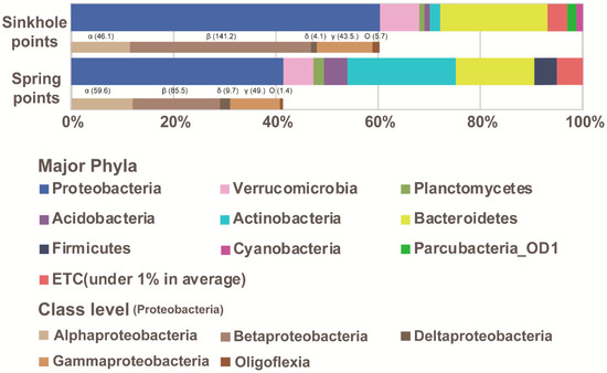 Moreover, Figure 9 shows the phylum compositions of samples based on the hydrogeological types of the samples, that is, from sinkhole and spring points. A clear distinction was evident in the microbial community based on hydrogeological conditions. Proteobacteria, Bacteroidetes and Verrucomicrobia were the major phyla in both the spring and sinkhole point samples. However, the spring points were heavily loaded with Actinobacteria. In particular, Firmicutes were only present in the spring points at a level 4.3%. These microbial composition results are consistent with the hydrogeological composition results. Furthermore, variations in the ecological indices may indicate the substantial influence exerted by the surrounding environment on the spring and sinkhole waters during transport within the karst areas.