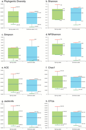 In order to analyze the bacterial alpha diversity in the nine stream water sampling sites, the samples were classified according to their stream water qualities, with respect to operational taxonomic units (OTUs), phylogenetic diversity and biotic diversity indices such as ACE, Chao1, jackknife, NPShannon and Shannon [41] (Figure 10). In the samples from the spring points, only the Simpson index was low, and the rest of the diversity indices were observed to be high. In the sinkhole waters, most of the indices, except for Simpson’s, were observed to be low. Therefore, the bacterial species’s richness and diversity were higher in the spring waters than in the sinkhole waters.