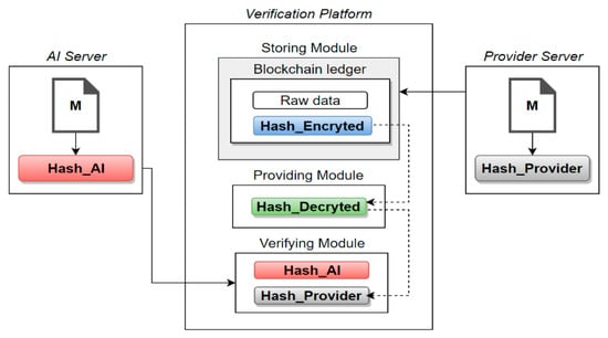 In the AI learning environment, data should be verifiable through tracking of raw data and processing data. Figure 3 shows the configuration to verify the integrity of AI learning data. The verification node of the system connected with the AI server over wired and wireless networks conducts verification of the data through connection with the blockchain server. The verification node receives data from the data provision node and stores it in blockchain, and upon the AI server’s request for data, the data stored in blockchain are provided to the AI server. This process forms a verification environment for AI learning. The data provider layer in the verification environment model transmits raw data and their hashcode to the data layer. The data layer for data management and collection encrypts the data and hashcode received from the provider layer and stores them in blockchain. The AI machine learning layer receives the data and encrypted hashcode from the data layer, teaches the AI, and derives results through learning patterns for model management.