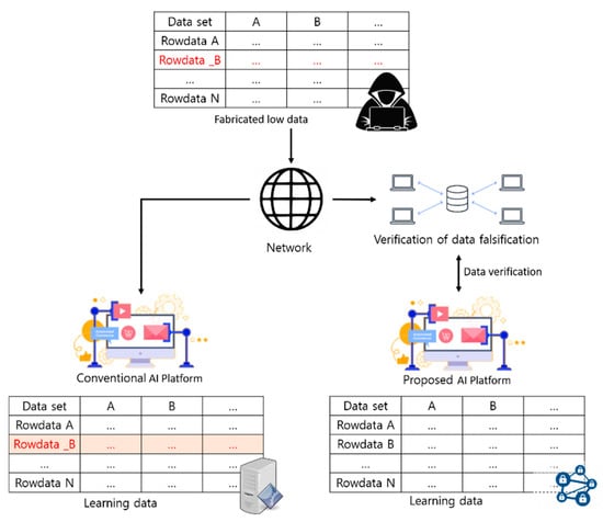 There are various services of collecting and processing data to be applied to AI, but the reliability of information is still an issue. The source of copious unreliable data uploads for malicious purposes needs to be analyzed and identified, and a traceable learning data collection environment is required. In general, the central server exists to control open data, so if an intermediary server stops or is modulated, many security threats can occur, including degradation of information reliability and availability. In addition, AI learning data present a type of big data in the course of collection, so the stability of a big data server is required [,,,,].