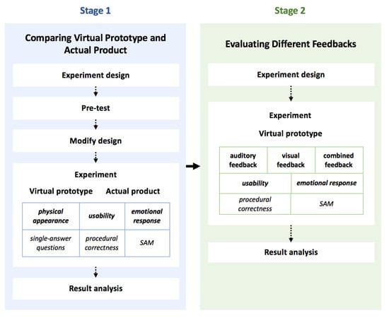 We conducted two-stage experiments to comprehensively investigate the users’ responses to various design attributes of the virtual prototypes and the product they aimed to represent. The experimental procedure is shown in Figure 1. The first stage aims to identify potential differences between the effectiveness of design evaluation with a virtual prototype and actual product. A pretest was carried out to improve the original design of the experiments. Subjects evaluated both the virtual prototype and actual product from three aspects: Physical/appearance, usability, and emotional response by the measure of single-answer questions, procedural correctness, and an emotional scale, respectively. A statistical analysis of the experimental results helps identify significant differences existing in the two evaluation forms. Specific product functions showing the differences were also recognized from the analysis. The design of the questions (single answer with five options) was not justified compared to other alternatives. This is a limitation of the methodology used by this study.