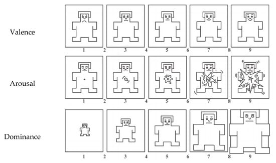 It would be interesting to recognize the emotional responses of a subject when conducting individual evaluation tasks. We employed the self-assessment manikin (SAM) scale, which was developed by Bradley and Liang [24]. This is a visually-based emotional scale developed according to the three emotional constructs proposed by Russell and Mehrabian [25]. For each construct, there exists five pictorial manikins, each of which is accompanied by a nine-level scale. As shown in Figure 3, the three constructs are: