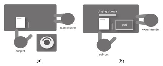 The experiments were carried out in a quiet room with sufficient lighting and space for the participants to comfortably perform the experimental tasks. In an orientation session prior to the experiment, the experimenter explained the procedure and testing rules, and the participants were free to ask questions during the session. Talking was not allowed during the actual experiment. The experimental setup for the physical and virtual groups, respectively, will now be described. As shown in Figure 5a, the smart vacuum cleaner was placed in a low platform close to the ground. The participants inspected the device and performed the required tasks. They could freely lift the product with hands during the experiment for the weight estimation. Then, they responded to the questionnaire, including the SAM, by filling in the answer sheets that were placed on the desk.