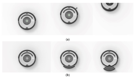 - Visual Feedback: When pressing the power button, an indication light was turned on. After the entire task had been completed, the device moved up to the top of the pad’s screen and its brush started to rotate (Figure 7a). For the dirt-offloading task, the dirt container moved out of the device (Figure 7b).