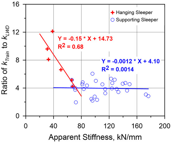 In Figure 2, when the sleepers are divided into hanging and supporting sleeper groups, a trend line for each group can be drawn. R2 is the coefficient of determination. The R2 of the hanging sleeper group was 0.68. This means that the ratio of ktrain to kLWD could be calculated with a probability of 68% when using the apparent stiffness kLWD and trend line. On the other hand, the R2 of the supporting sleepers was 0.0014. This very low R2 value indicates that ktrain is almost independent of kLWD for supporting sleepers. The ratio of ktrain to kLWD is about 4 regardless of the apparent stiffness kLWD. The two trend lines (i.e., hanging sleepers and supporting sleepers) intersect at apparent stiffness of 70 to 80 kN/mm.