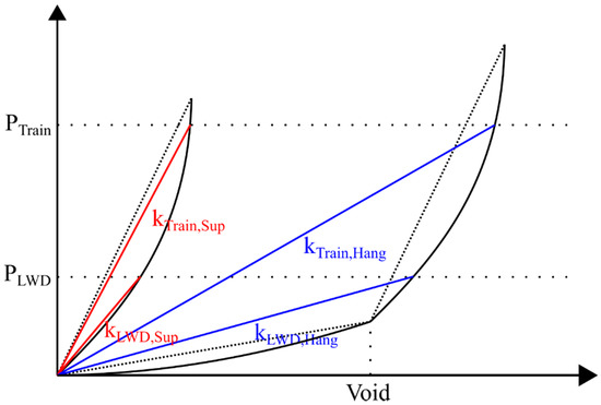 Park et al. [14] measured and compared the apparent stiffness under the LFWD load (10 kN) and under train load (80 kN) to look into the effect of loading level on track stiffness. The apparent stiffness under train load was calculated using the ratio of the maximum train wheel load measured between sleepers to the maximum sleeper displacement. The comparison between the stiffness values (kTrain/kLWD) resulted in a significant correlation. Figure 2 shows the result of calculating the ratio of the two sets of apparent stiffness. In the graph, the x-axis is the apparent stiffness measured by the LFWD and the y-axis is the ratio between the stiffness values (kTrain/kLWD). As can be seen from the graph, the sleepers could be divided into two groups based on the stiffness measurement: supporting sleepers which have relatively great stiffness and hanging sleepers which have relatively smaller stiffness. The ratio appears to be constant at about 4 for the relatively great stiffness, whereas the ratio increases as the apparent stiffness decreases for relatively smaller apparent stiffness. That is, the ratio is distributed like a bi-linear function. This is because as the degree of sleeper hanging increases, the difference in the stiffness based on the load size also increases [15]. Figure 3 shows the load–deflection characteristics of ballasted track. In the case of a supporting sleeper, which means there is no void under the sleeper, the difference according to load level (kTrain,Sup/kLWD,sup) is small. In the case of a hanging sleeper, which means there is a void under the sleeper, the bigger the void, the bigger the difference according to load level (kTrain,Hang/kLWD,Hang).