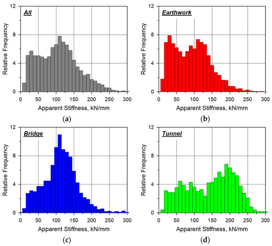 Relative frequency of apparent stiffness: (a) All; (b) Earthwork; (c) Bridge; (d) Tunnel.