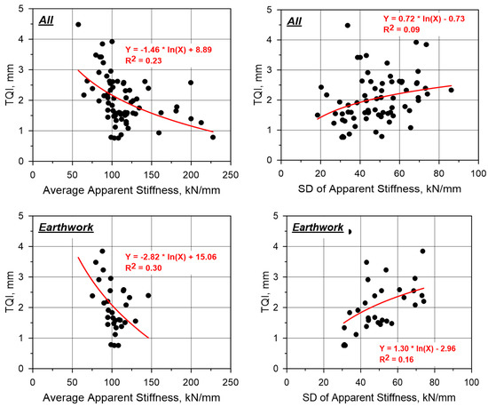 Figure 5 depicts the correlation between apparent stiffness and TQI. In the figure, R2 is the coefficient of determination. R2 is between 0 and 1; as R2 gets closer to 1, the two variables become more dependent. As a result of comparing the apparent stiffness average and TQI, the overall correlation was found to be very low, with R2 of 0.23. As seen already, it is more appropriate to compare the average and TQI by substructure classification because the apparent stiffness distribution characteristics are different for each substructure. As a result of the comparison with categorization by substructure, the R2 value was 0.30 for earthwork, 0.10 for bridges, and 0.58 for tunnels. The tunnels showed some correlation, whereas the earthwork and the bridges showed low correlation. As a result of comparing the standard deviation of apparent stiffness and TQI, it was found that there was even less correlation for the standard deviation than for the mean.