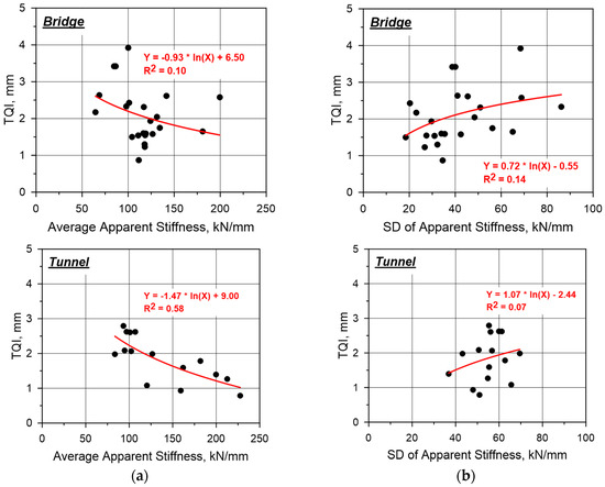 Apparent stiffness versus Track Quality Index (TQI): (a) Average vs. TQI; (b) Standard deviation vs. TQI.