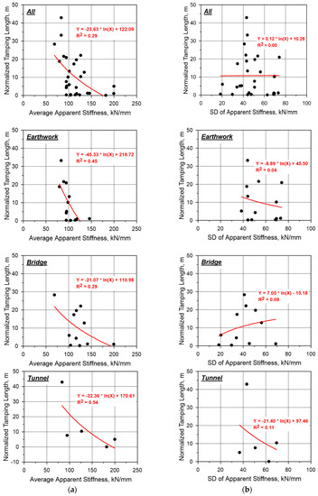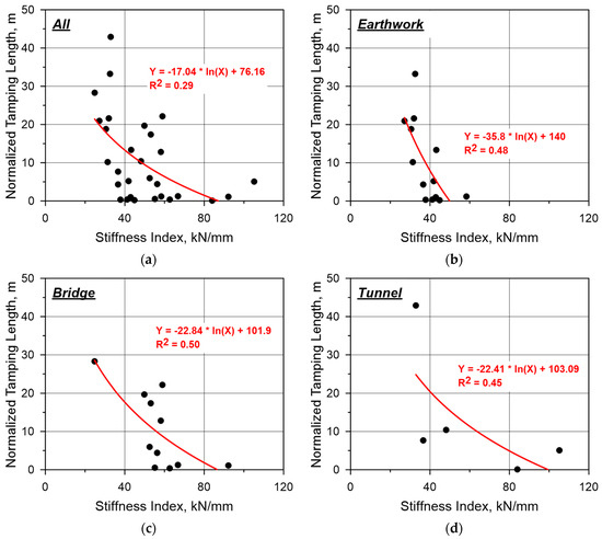 Based on the correlation between the track stiffness index and cumulative tamping length, the results of analyzing all the data at once showed a very low correlation. Furthermore, compared with the case of using the average alone, it was confirmed that the R2 value of bridges rose significantly to 0.50. In contrast, the R2 of the earthwork rose slightly to 0.48 and that of the tunnels decreased slightly to 0.45. In the case of tunnels, the number of field test locations was relatively small in comparison with others. More field tests are needed to develop a more accurate correlation.