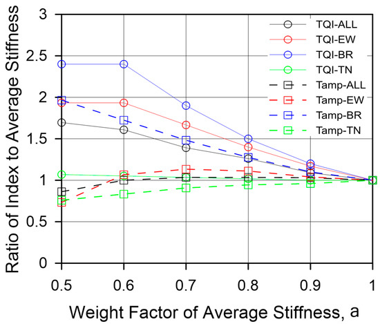 Because the effects of the average and standard deviation on track status evaluation are different, each factor is multiplied by a weight. To derive the track stiffness index that has the largest correlation with TQI and cumulative tamping length as a track status evaluation index, the weight α of the average was changed in the range from 0.5 to 1, and the correlations with TQI and cumulative tamping length were compared and represented in Table 5. The result of the comparison of the correlation coefficient with the apparent stiffness average is shown in Figure 7. As can be seen from the graph, the correlation coefficient between the stiffness index and TQI increases until α is 0.6 and then decreases gradually. In addition, the correlation coefficient between the stiffness index and tamping length decreases slightly when α is 0.5 and then increases gradually; however, the increase is smaller than that in TQI. Therefore, when α was 0.6, the track stiffness index was determined to be the most suitable to be used as the track status evaluation index.