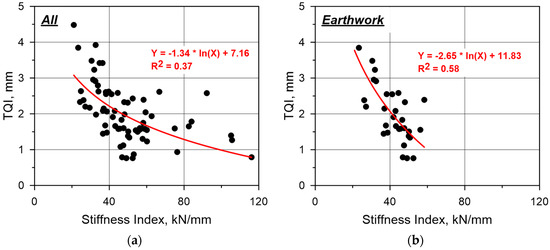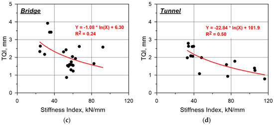 The results are shown in Figure 8 and Figure 9. Based on the analysis of the correlation between the track stiffness index and TQI, it can be observed that R2 is significantly increased compared with the case of using the average alone. For the earthwork and tunnels, the correlation coefficients increased significantly to 0.58 and 0.61, respectively. However, regardless of the substructure, the result of analyzing the correlation at once showed R2 values as small as 0.39, which means that it is appropriate to analyze the correlation by substructure categorization because the characteristics of the substructure are reflected in the apparent track stiffness as described above. For the bridges, R2 slightly increased to 0.24, although the correlation was still very low.