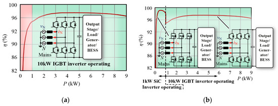 Example efficiency curves of (a) a standard 3-phase 10 kW IGBT inverter and (b) a combination of both, SiC and IGBT inverter where a 1 kW SiC inverter is operating during load conditions of 0 to 1 kW and the 10 kW Si–IGBT inverter for any mode >1 kW.