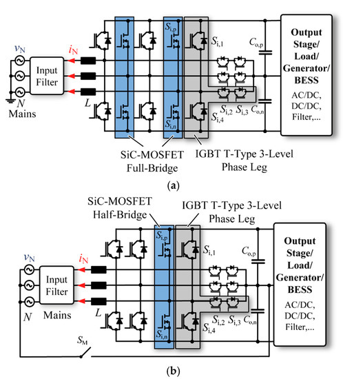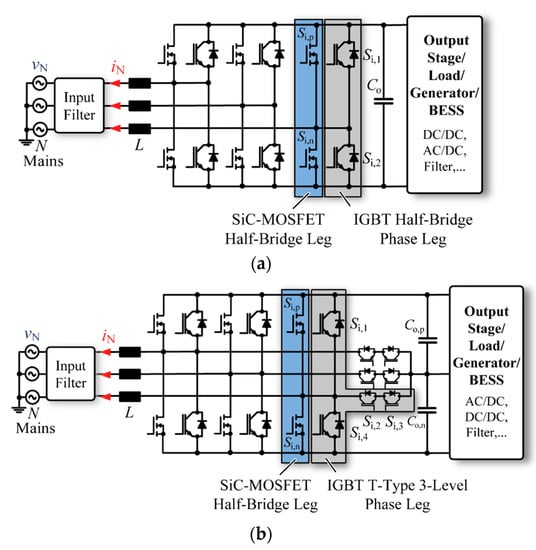 Three-phase grid-connected (a) 6-switch or (b) t-type IGBT-based rectifier/inverter with equipped 3 different SiC half-bridge legs for each converter input phase.