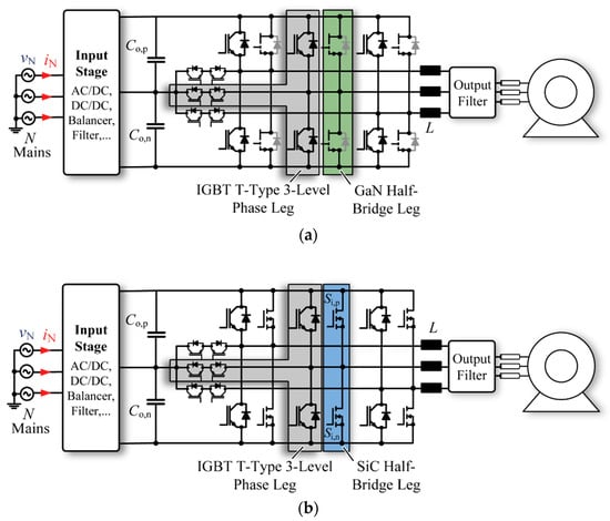 Three-phase IGBT-based t-type drive system with either (a) GaN half-bridge stages for 400 VDC or (b) SiC half-bridge stages for 800-VDC DC-link voltage levels.