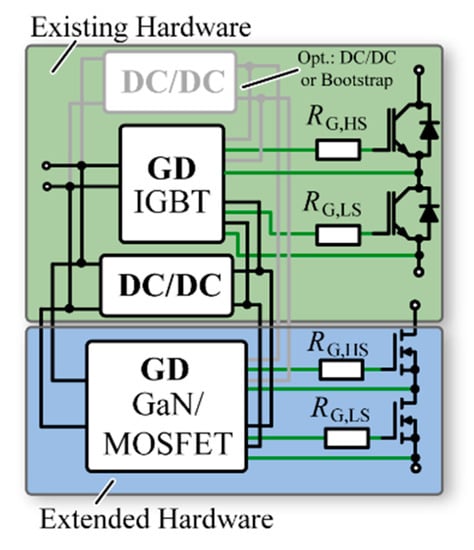 Auxiliary circuits for driving existing IGBTs (DC/DC converter(s), bootstrap, gate driver,…) and reutilization for light-load operating SiC/GaN extension.
