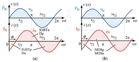 As depicted in Figure 6, it can be observed that for an IGBT-based three-phase six-switch inverter the high-side IGBT (IGBTp; IGBTp turned ON) and low-side reverse conducting diode (Dn; IGBTp turned OFF) are stressed during negative input currents iN(φ), whereas low-side IGBT (IGBTn; IGBTn turned ON) and high-side reverse conducting diode (Dn; IGBTn turned OFF) are stressed during the positive half-wave of the input current iN(φ).