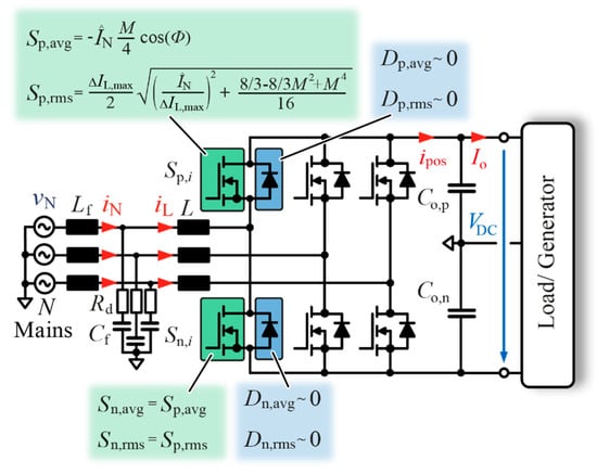 Second, it is assumed that the midpoint of the DC-link is connected to the artificial star point of the Y-connected input filter capacitors and/or neutral created by the 3-phase grid formation. This allows for simpler analytical equations compared to a floating setup. However, in such configuration, the current ripple of each phase is considerably higher due to the fixed midpoint of the DC-link and the mission common-mode voltage, which is usually introducing additional voltage levels manipulating the current ripple characteristics for the whole sinusoidal period of 0 ≤ φ ≤ 2π.