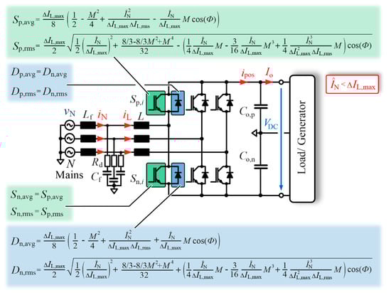 In general, for evaluation of conduction losses of hard-switched AC/DC or DC/AC converter topologies, only losses during nominal load operation of the circuit are of interest as these are the worst-case losses under normal conditions. These losses are of interest for heatsink design and evaluation of system efficiency. As the current ripple has minor effects in terms of avg and rms values under these nominal conditions, it is often omitted to simplify relevant design equations. Besides the modulation index M and the phase shift angle (Φ) of the fundamental current, these equations are only dependent on mains rms IN,rms or peak IN,pk current, respectively.