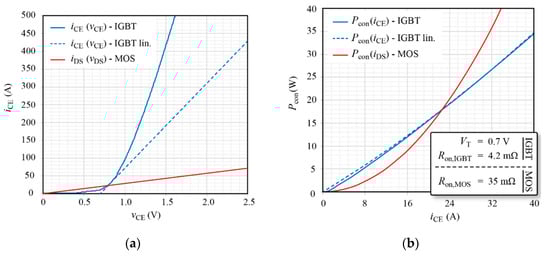 For accurate results, V/I datasheet results are transferred into an I/P curve (cf., Figure 9b). The I/P curve is then used to generate a similar conduction loss characteristic according to Equation (21), which represents the original loss properties in the low power region as precisely as possible. The obtained values for VT and Ron,IGBT can be verified by utilizing the-in-the V/I graph (retransferred linearized model). The same approach can be applied to extract linearized diode parameters of the forward–voltage VD and the equivalent resistance RD. Results for IGBT and diode characteristics can be found in Table 3.