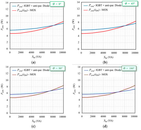 Conduction loss comparison of SiC MOSFET and Si–IGBT with an antiparallel diode for various load situations from 0 to 10 kVA and different phase angles of (a) Φ = 0° which results in cos(Φ) = 1, (b) Φ = 45°, (c) Φ = 90° and (d) Φ = 180°.