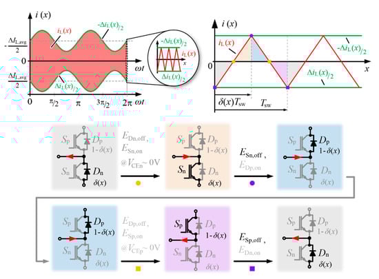 In order to derive the switching losses under the light-load condition, the commutation of both devices (IGBT and MOSFET) has to be studied in detail. For the sake of simplicity switching losses under no-load operation are determined. An occurring switching sequence that is representing the switching losses for one the IGBT device is illustrated in Figure 11. Assuming the initial condition of the negative input current (x = 0) and the low-side IGBT is being activated, results in the low-side diode as the current conducting device as the IGBT cannot process negative currents while gated. During the transition from negative to positive values, the input current is commutated from the low-side diode (Dn) to low-side IGBT (Sn) at nearly zero voltage of VCE. Therefore, negligibly small switching losses emerge during this crossover (Figure 11—yellow circle). When Sn is turned OFF, and Sp not turned ON due to the existing dead-time, the current from Sn is commutating to Dp. Therefore, turn-off losses of the low-side IGBT Sn must be considered (Figure 11—purple circle). When the high-side IGBT Sp is activated, the input current will be still free-wheeling through the high-side diode Dp, due to its positive nature. Only when the input current reverses its sign again, the current will commutate from high-side diode Dp to high-side IGBT Sp at approximately zero voltage (Figure 11—yellow square). If the Sp is turned OFF, the input current will transition back to the negative diode Dn. This commutation process results in turn-off losses of the high-side switch Sp occurring at full DC-link voltage (Figure 11—purple square).