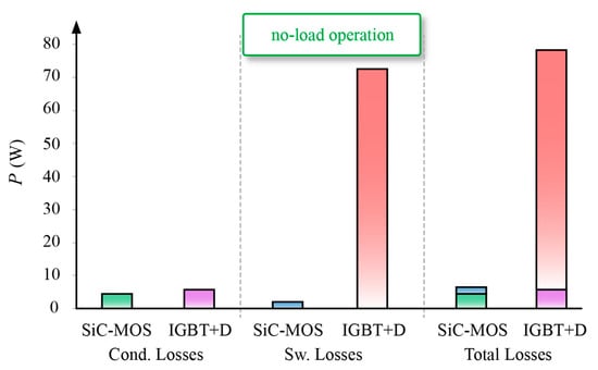 As can be observed, the switching losses of the IGBT module under no-load operation and a switching frequency of 10 kHz results in 72.6 W per IGBT, whereas the equipped SiC–MOSFET only comes with 1.84 W.