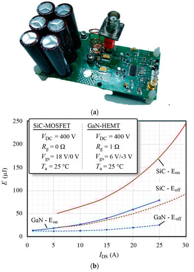 (a) Testbench for benchmarking and extraction of turn-on and turn-off switching losses of a 650 V/30 A GaN transistor; (b) switching loss comparison of 650 V/30 A SiC–MOSFET and GaN transistor.